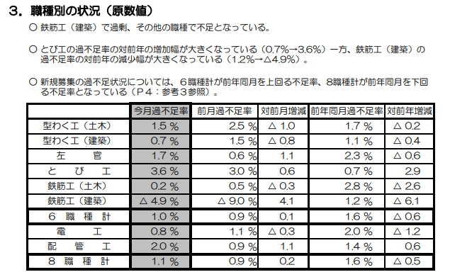 職種別の状況では、型わく工(土木)・ 型わく工(建築)・左官・とび工・鉄筋工(土木)・鉄筋工(建築)の6職種と、更に電工・配管工を加えた8職種の過不足率が掲載されています。