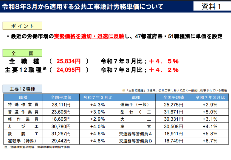 全職種平均で4.5%の増加となっており、工事業全体にとって無視できない改定です。