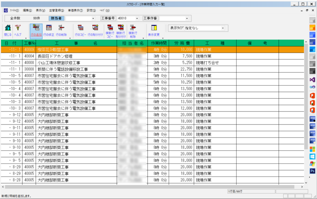 ハウロードシリーズの作業時間入力機能は、担当者毎の個別の作業時間や、深夜作業や休日出勤などの特殊条件にも対応。
