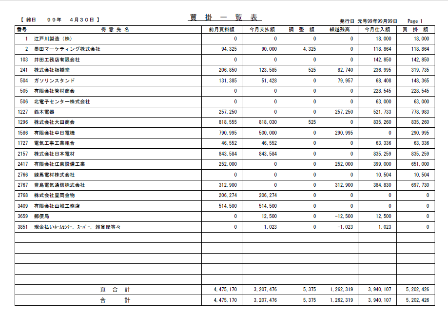 「買掛一覧表」は、仕入れ先や外注先への支払い状況を一覧で確認できる帳票です。