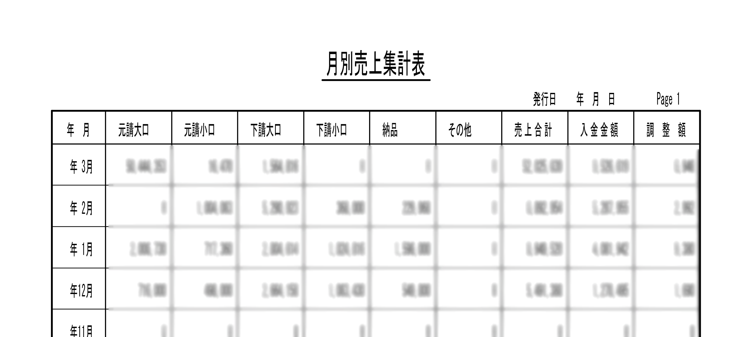 取引先や工事別の売上を、月単位で集計してくれるこの帳票は、売上の推移や繁忙期の傾向を一目で把握できる優れものです。