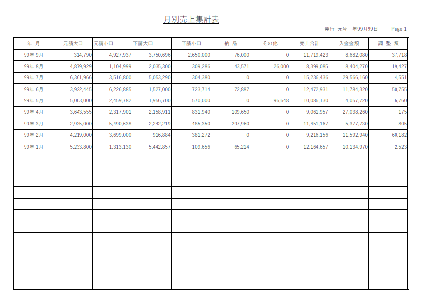 月別売上集計表は、売上データを月単位で集計し一覧で表示した帳票です。