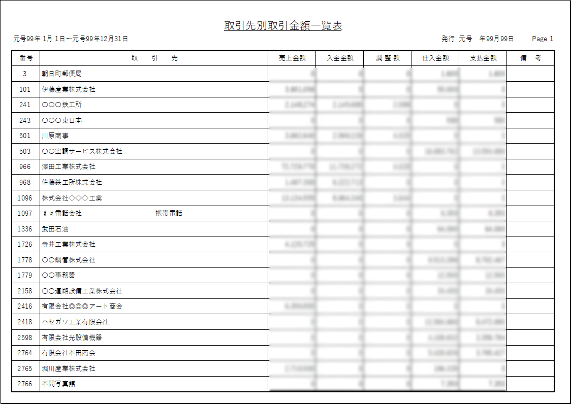 指定した期間内における各取引先との「売上金額」「入金金額」「仕入金額」「支払金額」などを一覧形式で出力。