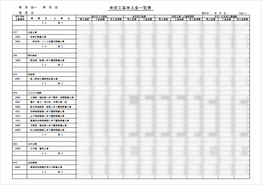未成工事未入金一覧表は、未成工事(まだ完了していない工事)に対する入金状況を一覧で把握できる帳票です。