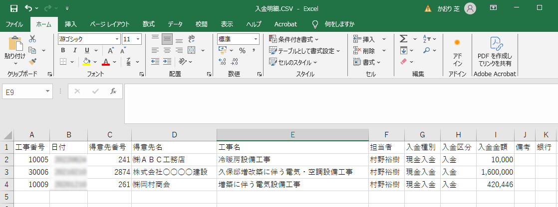 工事単位で入金状況を自動集計し、一覧ファイルとして出力できる機能です。