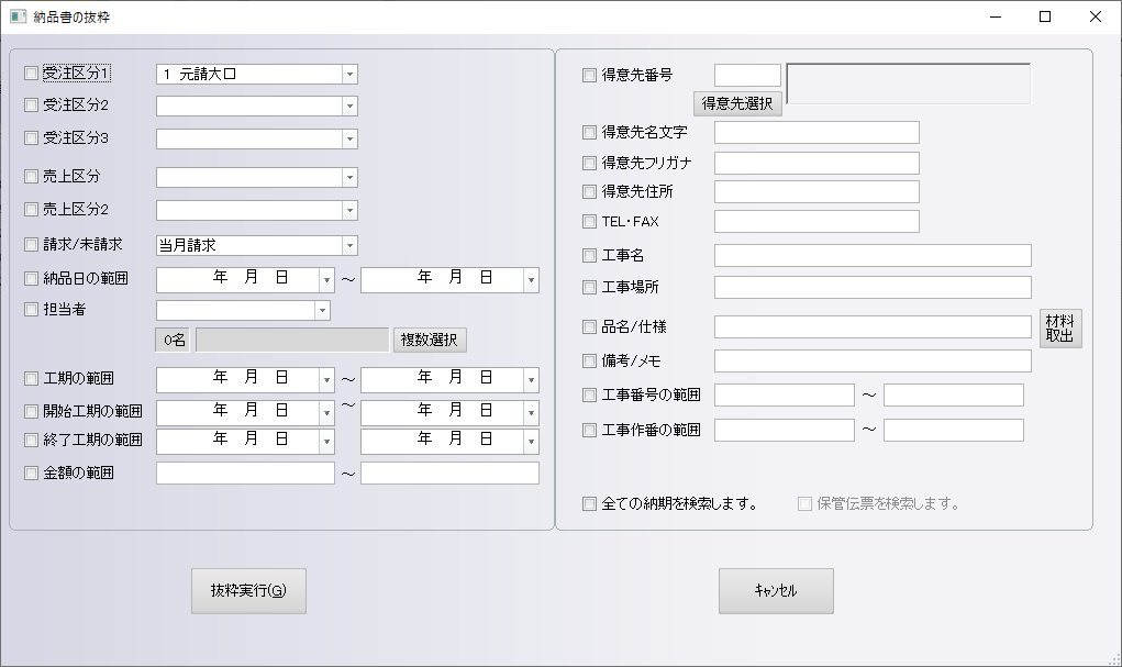 担当者別・得意先別・金額帯・工期・未請求区分など、必要な条件で絞り込みができるため、確認作業のスピードが格段にアップします。