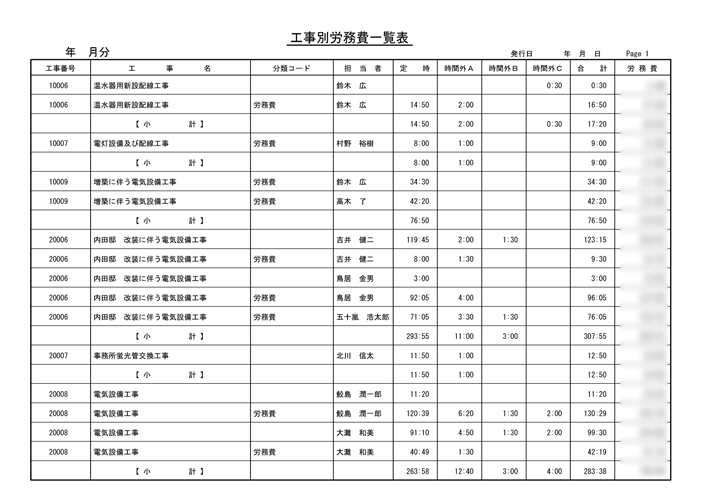 工事番号ごとに、どの担当者が・何時間働いて・労務費がいくらかかったかを一覧で表示。