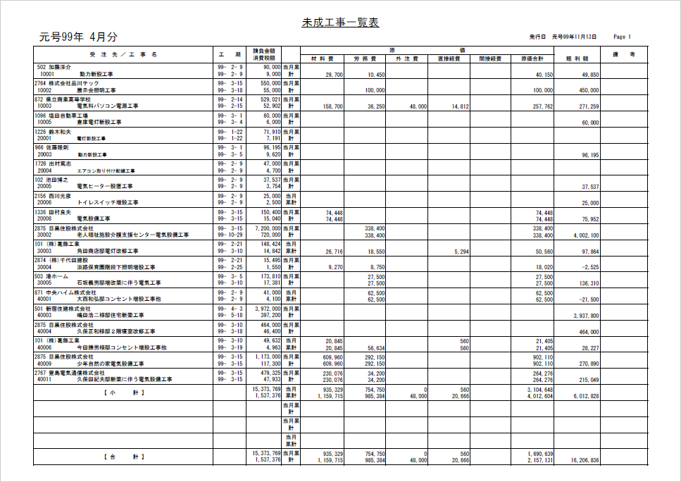 未成工事一覧表では、工事ごとの請負金額、工期、現在までに発生した原価を一覧で確認することができます。