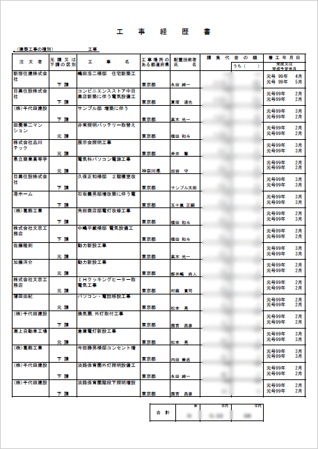 「工事経歴書(工事実績表)」とは、過去に受注・施工した工事内容を一覧にまとめた帳票です。