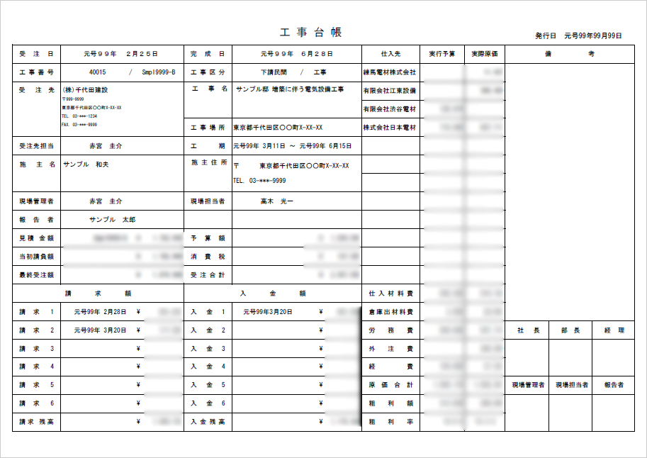 工事台帳は、その名のとおり、一つの工事に関するすべての情報を一元管理できる帳票です。