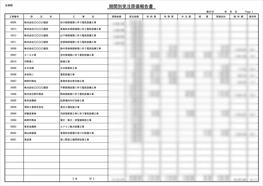 期間別受注原価報告書は、指定した期間内に受注した工事だけを自動で抽出し、受注金額・原価・粗利などを一覧で表示。