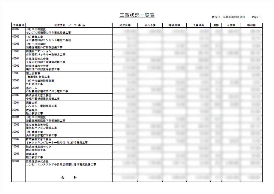 工事状況一覧表は、各工事の進捗状況や収支情報を「一覧」で確認できる帳票です。