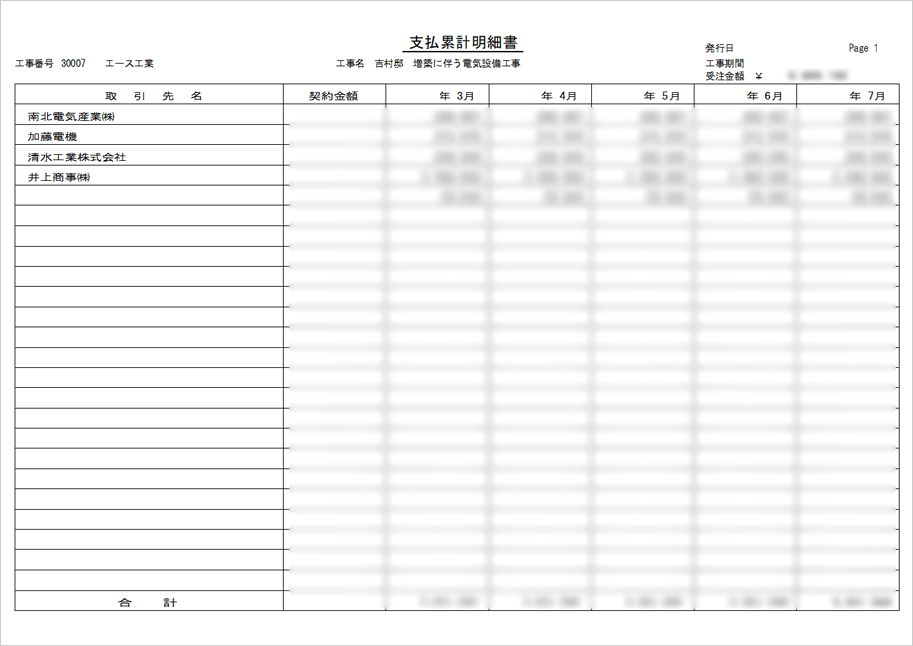 工事ごとの取引先に対する支払状況を一覧で把握できる帳票です。