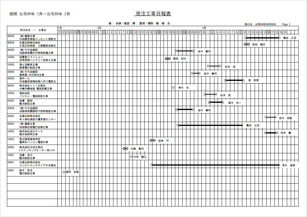 「いつ」「どの工事が」「誰の担当で」「どれくらいの期間」動いているのかを横軸で一覧表示する“工事のカレンダー表”のような帳票です。