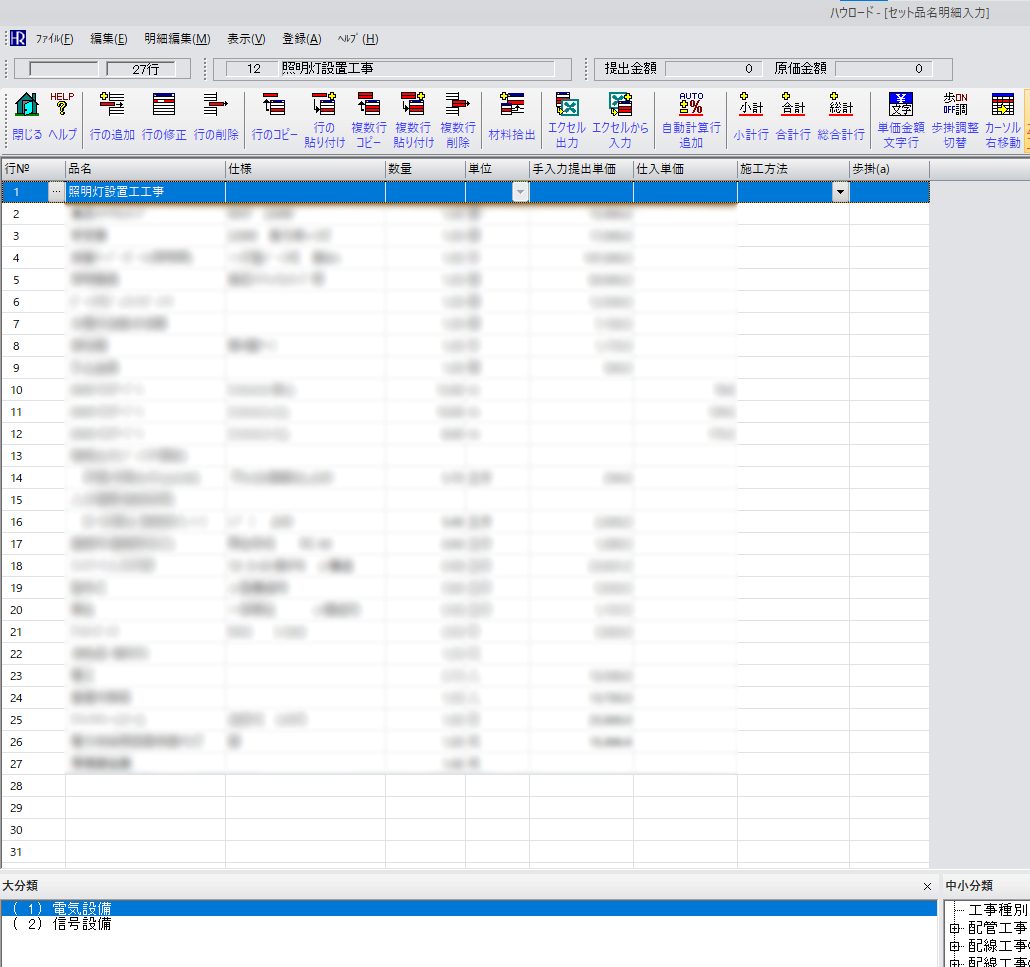 数十個以上の材料も、セット品名で登録しておくことでクリック操作で一括で見積に記載することが可能です。