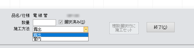 材料を選択する画面では、数量や施工方法を同時に選択できます。