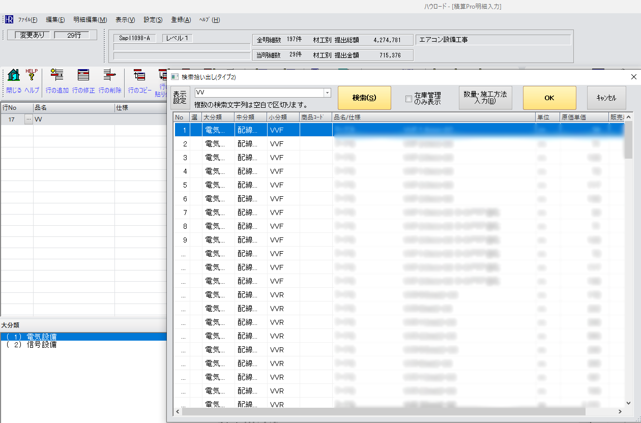 似た名称の材料が大量にある場合でも、効率的に見積書作成が行えます。